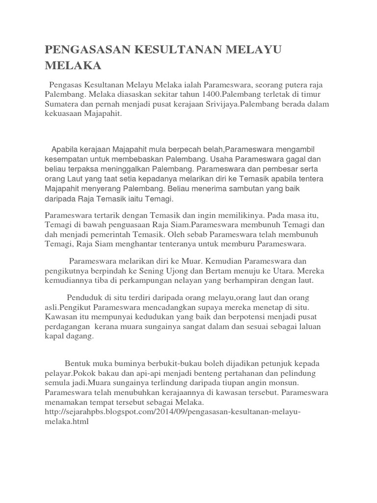 Tajuk ini merupakan salah satu topik dalam matapelajaran kajian tempatan sekolah rendah dan sejarah sekolah menengah. Parameswara merupakan turunan ketiga dari sri maharaja sang utama parameswara. Selepas kejatuhan kerajaan srivijaya di palembang, muncul kerajaan majapahit. *kegigihan parameswara membangunkan kesultanan melayu melaka. 5.1 pengasasan kesultanan melayu melaka.